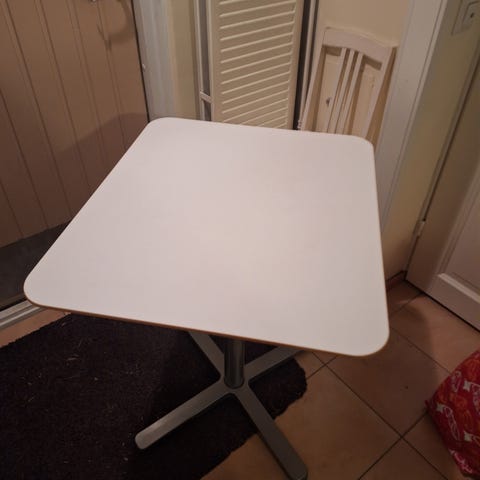 Ikean valkoinen työpöytä, ollut käytössä noin muutaman vuoden. Pöydän molemmissa jaloissa tuolin osumisesta lähteneet maalit mutta uskon että saisi helposti maalattua piiloon. Keskihyllyn toinen etummainen hyllyn pidike on liikkunut niin että löystynyt ja sitten hävinnyt joten korvattu ruuvilla jolla hylly kestää paikallaa. Kysymällä lisää kuvia/tietoa!
