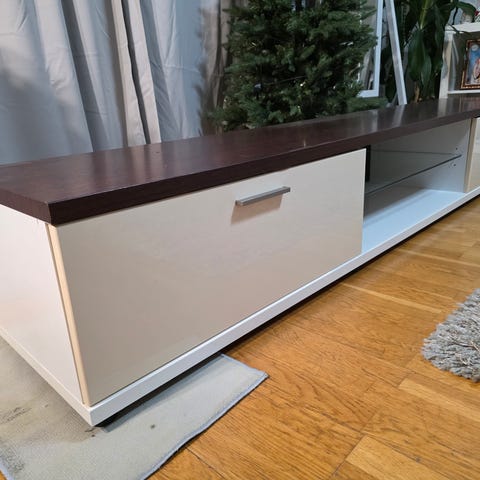 Annetaan vanha kotimaisen Puulonin Pinja -sarjan tv-taso, lev 85cm, kork pyörineen 45 cm ja syvyys 41 cm. Pyörät saa lukittua. Kaksi laatikkoa ja avohylly. Muutama kolhu, kts kuvat. Voinee halutessaan hioa ja maalata koko tason.
