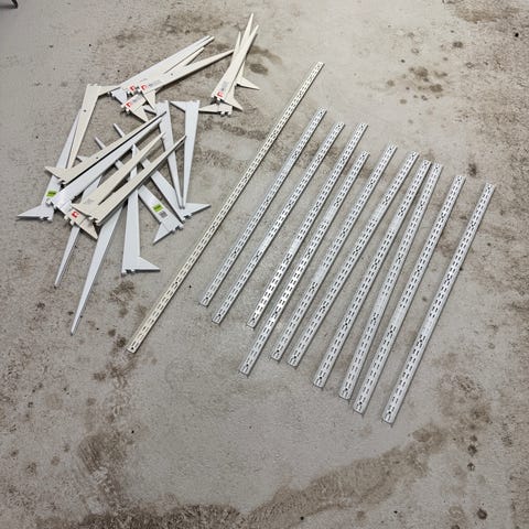 Ehjä, käytössä ollut autotallin hyllykkö. Mitat: Korkeus 186cm, yläosan leveys 30cm, alaosan leveys 60cm, pituus 100cm.