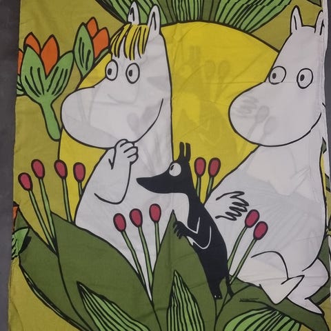 Lasten muumipussilakana (n. 150x128) ja tyynyliina (n. 60x38). Käytetty, hyvä kunto, mutta varmasti on haalistunut uudesta. Ei lemmikkejä, hajusteita tai tupakointia taloudessa.
