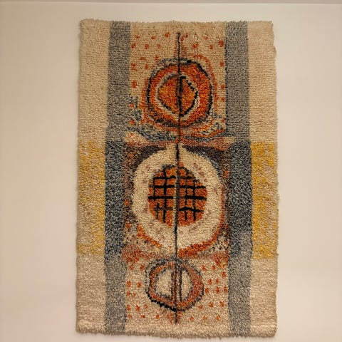 Vanha hyväkuntoinen Kehrä-ryijy. Värit näkyvät paremmin lähikuvassa. Ei ole pesty. Säilytetty lämpimässä ja ollut seinällä, ei varastossa tms.