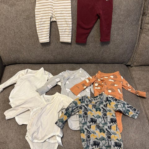 Vauvanvaatepaketti kokoa 50-56, käytettyjä mutta hyväkuntoisia. Yksi body on kokolapussa 62, mutta silmämääräisesti samankokoisen oloinen kuin nuo muutkin bodyt. 😊