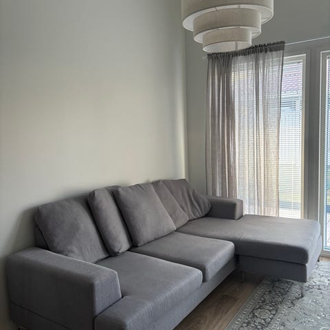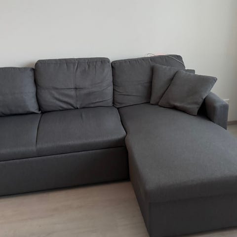 Harmaa levitettävä divaanisohva. Hyvässä kunnossa, vetoketjulliset päälliset selkänojan tyynyissä.