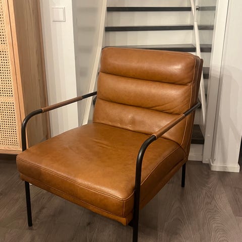 Upea, keinonahkainen nojatuoli / lepotuoli. Jalat metallia. Kaunis konjakinruskea väri. Ostettu Askosta. Siisti käytetty kunto. Istuinosan syvyys n. 48 cm. Selkänojan korkeus n. 42 cm. Pyydettäessä lisää kuvia. Savuton ja lemmikitön koti. Vain nouto Espoon Lippajärveltä. Maksu käteisellä tai Mobilepayllä.
