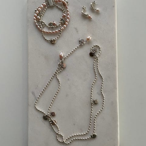 Kalevala Hopea ja Helmet naisten korusetti, joka sisältää useita hopeisia ja helmillä koristeltuja koruja. Setti sopii naisten käyttöön ja on valmistettu hopeasta ja helmistä.
