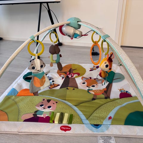 Sopii niin selällään kuin vatsallaan viihtyvälle lapselle, sillä kaarten asentoa saa muutettua. Mukana paristoilla toimiva kana, josta kuuluu musiikkia ja jossa vilkkuu valo.