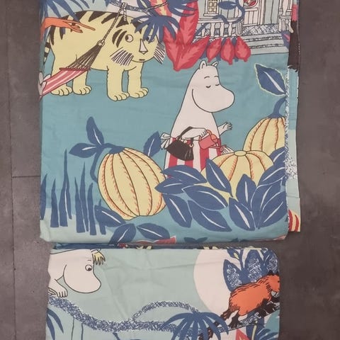 Lasten muumi-pussilakana (n. 110x155) ja tyynyliina (n. 40x54). Lakanassa musta painojälki levinneistä väreistä. Muuten kirkkaat värit.