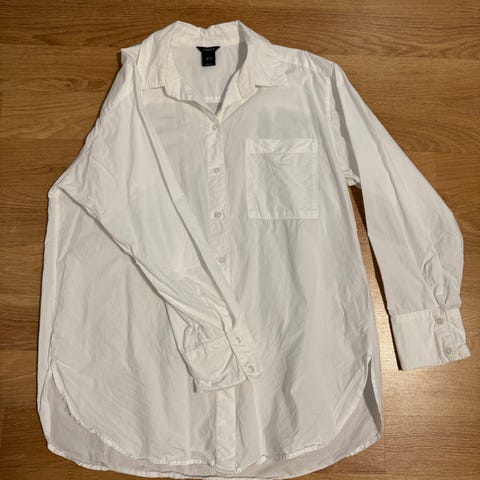 Paksua puuvillaneulosta, oversize. Ehjä ja tahraton. Väri valkoinen, mutta ei ihan vitivalkoinen.
