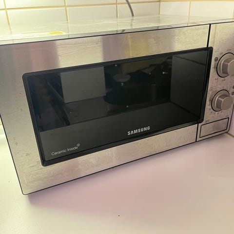 Samsung mikroaaltouuni teräsvärinen. Laite on varustettu pyörivällä lasialustalla ja metallisella ulkokuorella.