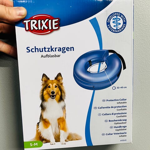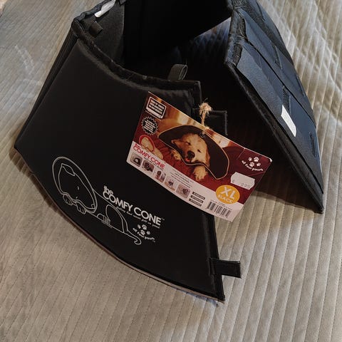 The Comfy cone käyttämätön pehmokauluri koiralle, lisätietoja löytyy netistä. Koko M/XL. Tämän kanssa on koiran mukavampi esim. nukkua.