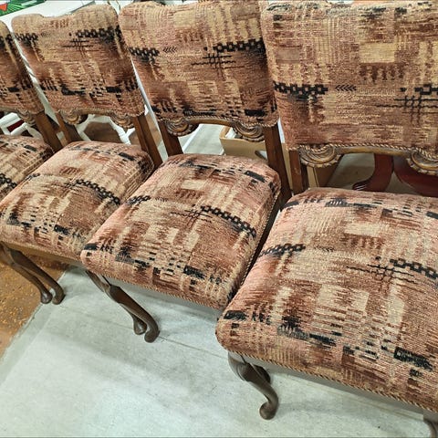 Vanha ruokapöytä ja neljä tuolia.