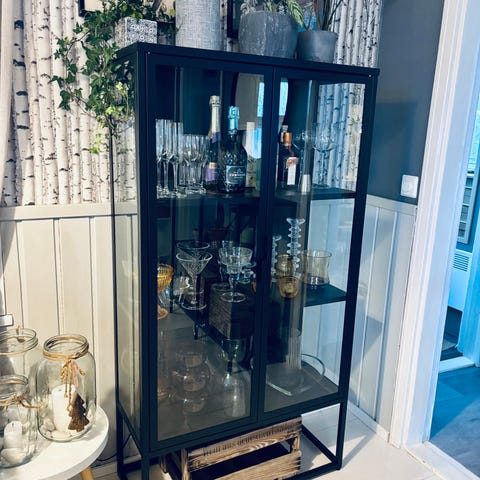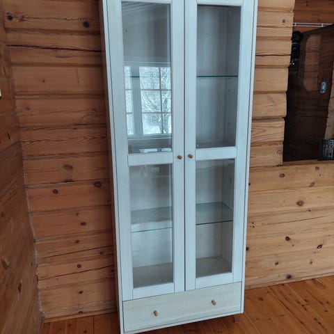 Myydän hyvässä kunnossa vitriinikaappi ja astiat lasit on kristalli.
