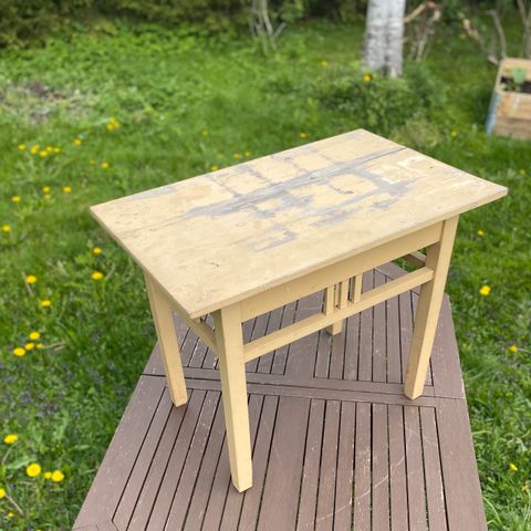 Ei isoja naarmuja tai halkemia pöytälevyssä. Pöydän jalassa ajan patinaa. Pöytä vuosaaressa