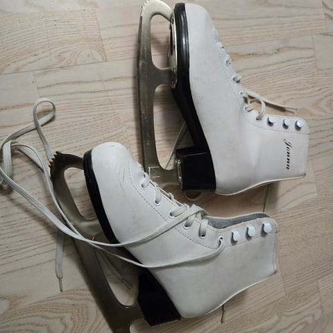 Tyttöjen kaunoluistimet, koko 35, väriltään valkoinen. Käytettyjä luistimia, jotka soveltuvat muun luistelun harrastamiseen.