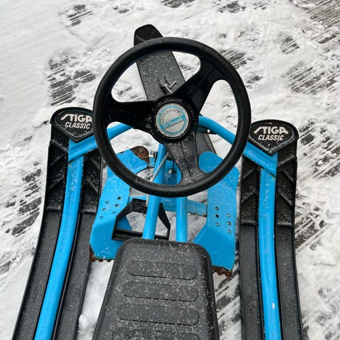 Uudempi kelkka. Oikean sivusuksen etupäässä halkeama, mutta ei haittaa laskemista.