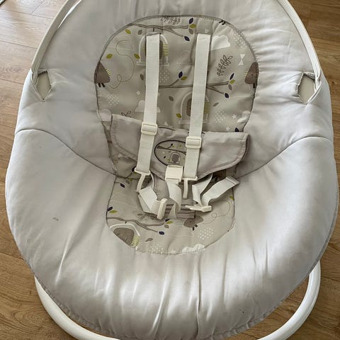 Käytettynä ostettu koliikkikeinu. Menee kasaan. Käytönjälkiä jonkin verran, kangas on siisti ja sen saa irti pesua varten.