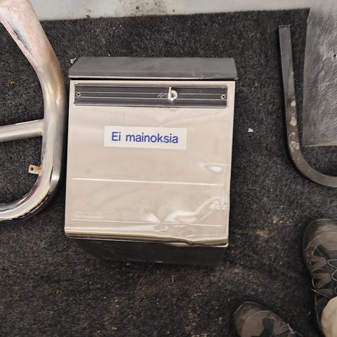 Vihreä postilaatikko ja tolppaan kiinnitysraudat