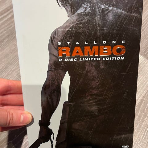 Rambo First Blood on DVD-muodossa oleva elokuva. Kansikuva esittää päähenkilöä ase kädessä. Elokuva kuuluu toiminta- ja seikkailugenreen suomitekstein. Ruotsikansilla suomitekstein.