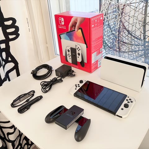 Mukaan tulee joy-coneille rannenauhat ja ohjain. Lisäksi telakka ja siihen virtajohto, jolla myös konsolin lataaminen onnistuu. HDMI ei ole alkuperäinen, mutta toimii kuitenkin normaalisti.