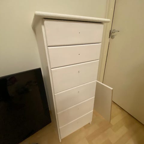 Korkea lipasto kuudella laatikolla. Vetimet tulee mukaan. Maalattu, maali osittain kulunut joistain kohdin. Yleisilme suht siisti.