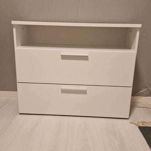 Myydään hyväkuntoinen valkoinen lipasto, jossa kaksi pienempää laatikkoa ja kolme isompaa.
