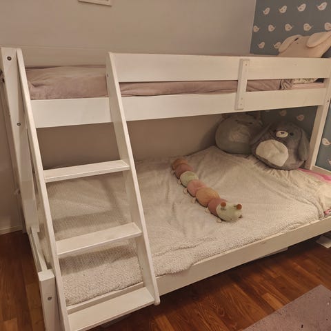 Myydään v. 2019 Lähdesmäeltä ostettu Timo-kerrossänky, nykyään näitä ei enää myynnissä. Mitat 75x160. Lisäturvalaita 16x61cm alasänkyyn.
