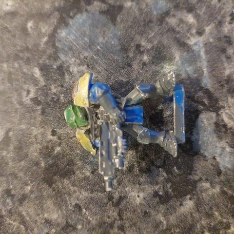 Myynnissä mysteerinen tapaus. Kuvahaun perusteella kyseessä olisi figuuri Robogear -nimisestä pelistä. Sitä on käytetty Warhammer 40k pelissä Armoured Sentinelinä, joten siinä roikkuva maalaamaton tykki ei ole originaali. Tykin saa napsaistua irti tarvittaessa, liima ei ole erityisen vahvaa.