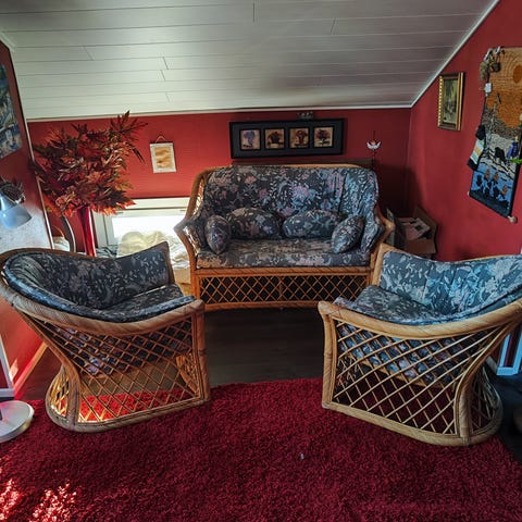 Sohvan päädyissä ja tuolien selkänojassa rottinki.