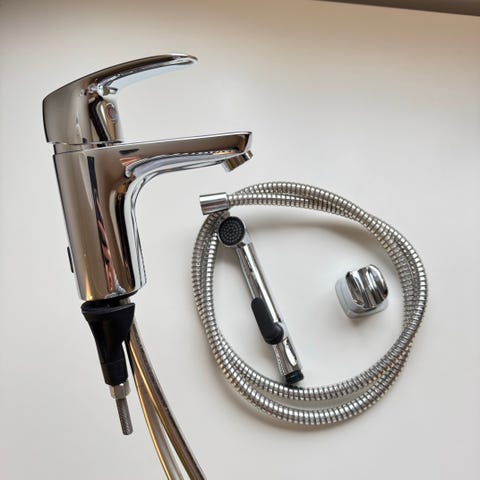 Pesuallashana, jossa Bidetta-käsisuihku, suihkuletku 1,5 m, ripustin ja kiinteä juoksuputki. Joustavat kytkentäputket.