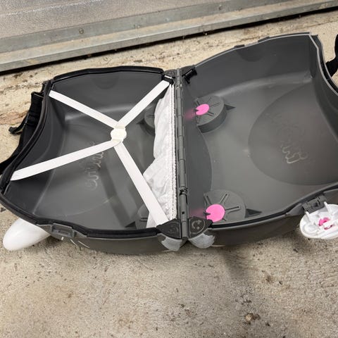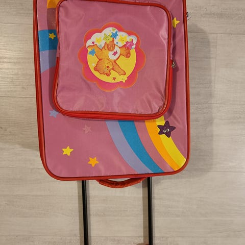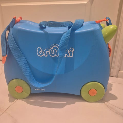 Lasten violetti matkalaukku Trunki. Pinnassa kolhuja mutta oikein soiva peli. Sisäpuolen kuminauha napakka, mukana pieni tasku. Lisäksi hihna jossa avain lukkoihin.