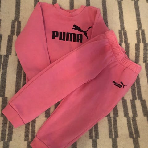 Lasten Puma-mwrkkinen collegepuku. Yhden lapsen käyttämä, mutta päiväkodissa olkapäähän tullut maalitahra, jota ei saa pois. Housujen tahrat huomasin vasta ilmoitusta tehdessä ja syynätessä, joten eivät näy käytössä.