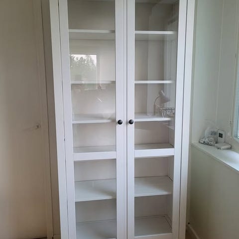 Ikea Hemnes vitriini lasiovilla ja hyllyillä, leveämpi alaosa.