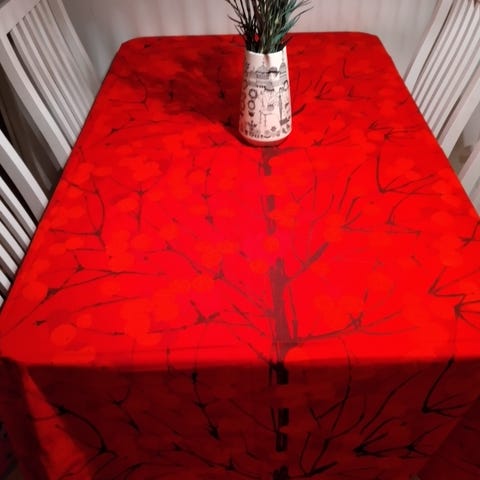 Marimekon ehjät, punaiset Lumimarja-verhot. Molemmissa hienoista haalistumaa toisessa pitkässä reunassa, saa käännettyä piiloon, talvivalaistuksessa ei tosin ikkunassa havaittavissa.