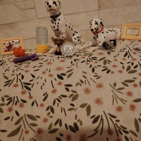 Hyväkuntoinen vanha Steiffin tehtaan dalmatiankoira. Korkeus noin 17cm. Metallinappi tallessa korvassa.