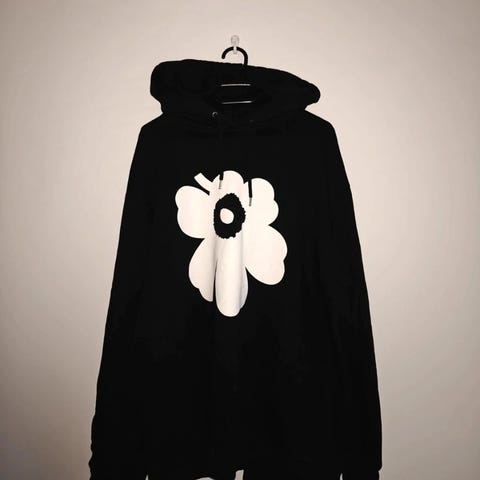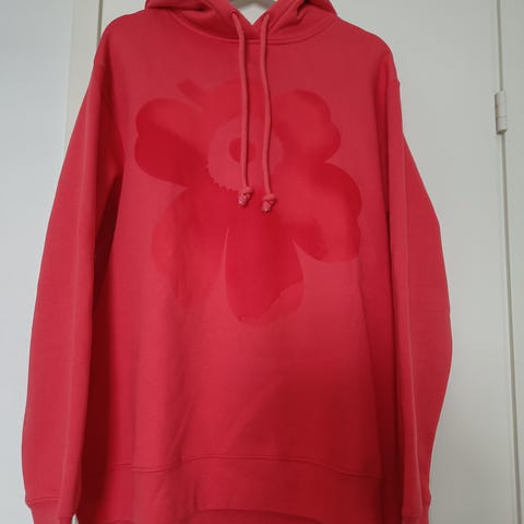 Myyntiin Marimekon Runoja-huppari. Se on almistettu paksusta puuvillatrikoosekoitteesta ja siinä on näyttävä Unikko-kuosin kukka etupuolella. Collegepaidan hupussa on kiristysnyörit ja se on unisex-mallinen ja -kokoinen.