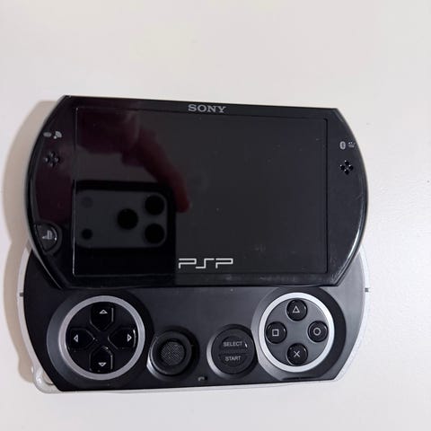 Sony PSP pelikonsoli kannettavaan pelaamiseen. Laite on musta ja sisältää standardit ohjaimet ja näytön.