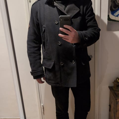 Takissa on hienoja yksityiskohtia, kuten kokometallinen vetoketju, napit hihansuissa, patched elbows (kyynärpääpaikat) ja kaksi napeilla suljettavaa takahalkiota.
