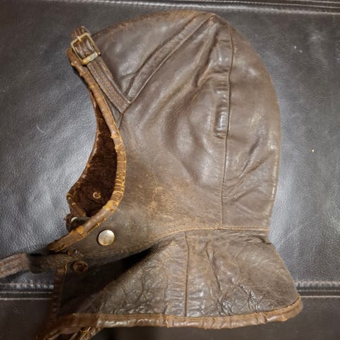 Nahkainen lentäjän hattu, on neppareita ja solkia laadukkaan oloinen lätsä. Koko lappu leikattu pois, arvio M