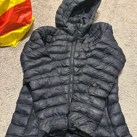 Siistikuntoinen toppatakki. Ainoat näkyvät virheet mielestäni toisen kyynärpään pikkuinen reiänalku sekä takana näkyvä vaalea tahra, todnäk pihkaa.