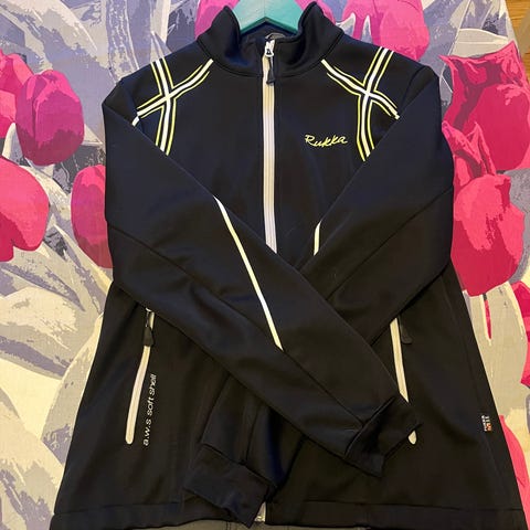 Ounasvaaran Hiihtoseuran hiihtoasu. Takki, housut ja liivi. Liivi erittäin hyvässä kunnossa. Takin vetoketjun vedin korjattu rautalangalla, muuten vetoketju on toimiva. Housujen polvessa kulumaa ja tummumista.