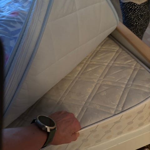 Päällyspatja on kulunut käytössä ja vaatii ehkä vaihtoa tai pesulaa, paksuimmat patjat ovat oikein hyvässä siistissä kunnossa. Kaikki ovat päällystetty samalla harmaalla kankaalla.