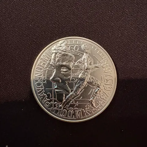 Suomi Finland juhlaraha, hopeanvärinen, mukana sininen kotelo. Juhlaraha esittää historiallista aihetta ja on tarkoitettu keräilyyn tai muistoesineeksi.