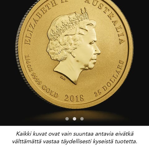 Royal Canadian Mint Kultakolikko, 1 unssi, 99999 puhtausaste kultaa. Kultakolikko on suojakotelossa, jossa on aitoustodistus. Kolikon halkaisija on 30mm ja paino 31,1 g. Kolikko on valmistettu puhtaasta kullasta.