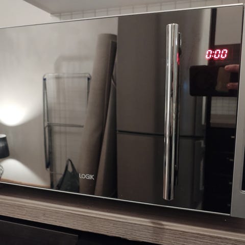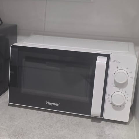 Toimiva Rosenlewin mikroaaltouuni muuton jälkeen ylimääräisenä myyntiin.