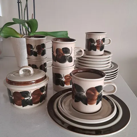 Arabia Ruija sokerikko, teekuppi ja kaksi kappaletta kahvikuppeja tasseineen. Ehjä ja siistikuntoinen setti yhteishintaan.