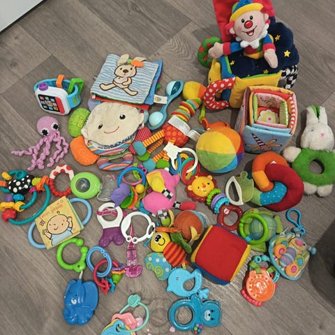 Vauvan lelusetti, joukossa erilaisia pehmeitä ja muovisia leluja. Sisältää pehmoeläimiä, puruleluja ja muita lasten leikkeihin soveltuvia tuotteita.