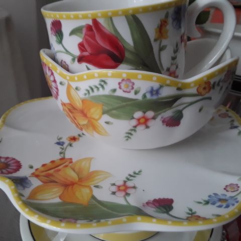 Myydään hyväkuntoiset Villeroy&Boch kahvi/teekupit alulautasineen. Leipälautanen kuuluu myös settiin. Kuppeja yhteensä 8 kappaletta. Yksi setti (kuppi+alulautanen+leipälautanen) yhteensä 28 euroa. Kaikki 8 yhteensä 200 euroa.