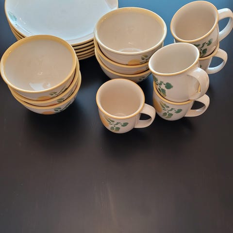 Setti hyväkuntoisia Pentikin keltainen omena -sarjan astioita.