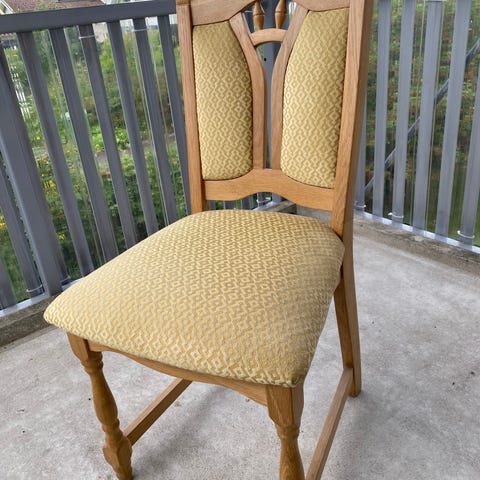 5 kaunista tammituolia. Täysin kunnostetut, hiottu/lakattu, pehmusteet/verhoilu uusittu. Ei ole ollut käytössä kunnostuksen jälkeen