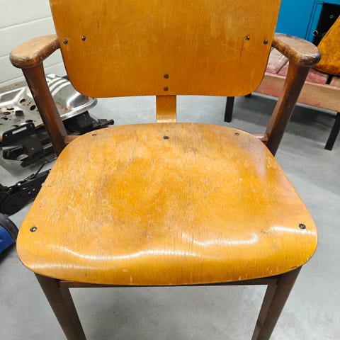 Istuin ja selkänoja muotoon puristettua koivuvaneria, runko ja käsinojat massiivikoivua. Istuinkorkeus 45 cm.